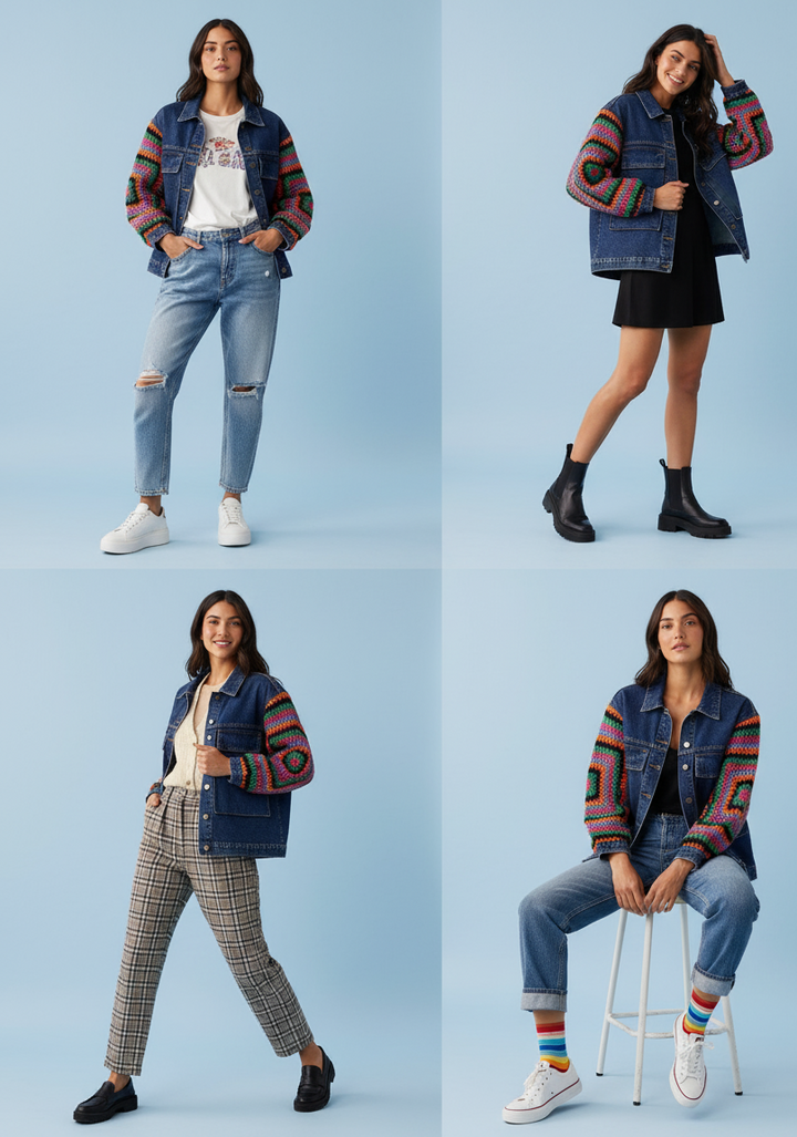 Each jacket features hand-crocheted sleeves stitched with care, turning an everyday denim piece into a wearable piece of craftsmanship. The mix of sturdy denim and soft crochet gives a perfect blend of structure and comfort, making it your go-to layering piece for every season.