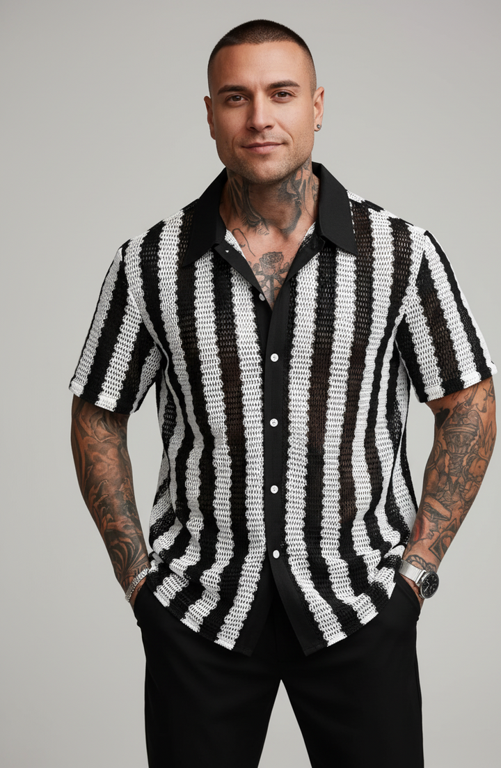 Handmade Black & White Crochet Knit Shirt – Men’s Vintage Striped Button-Up