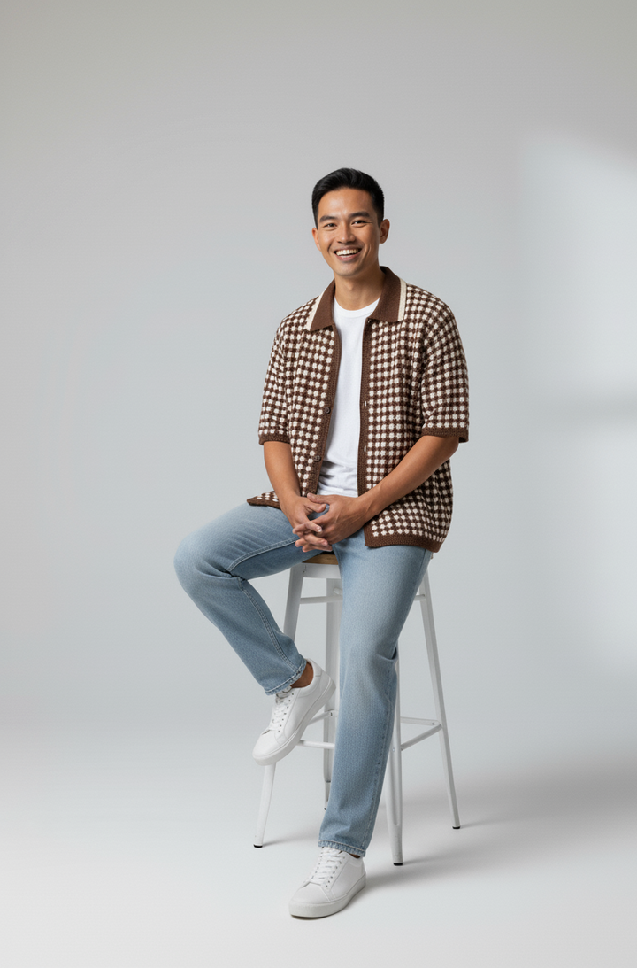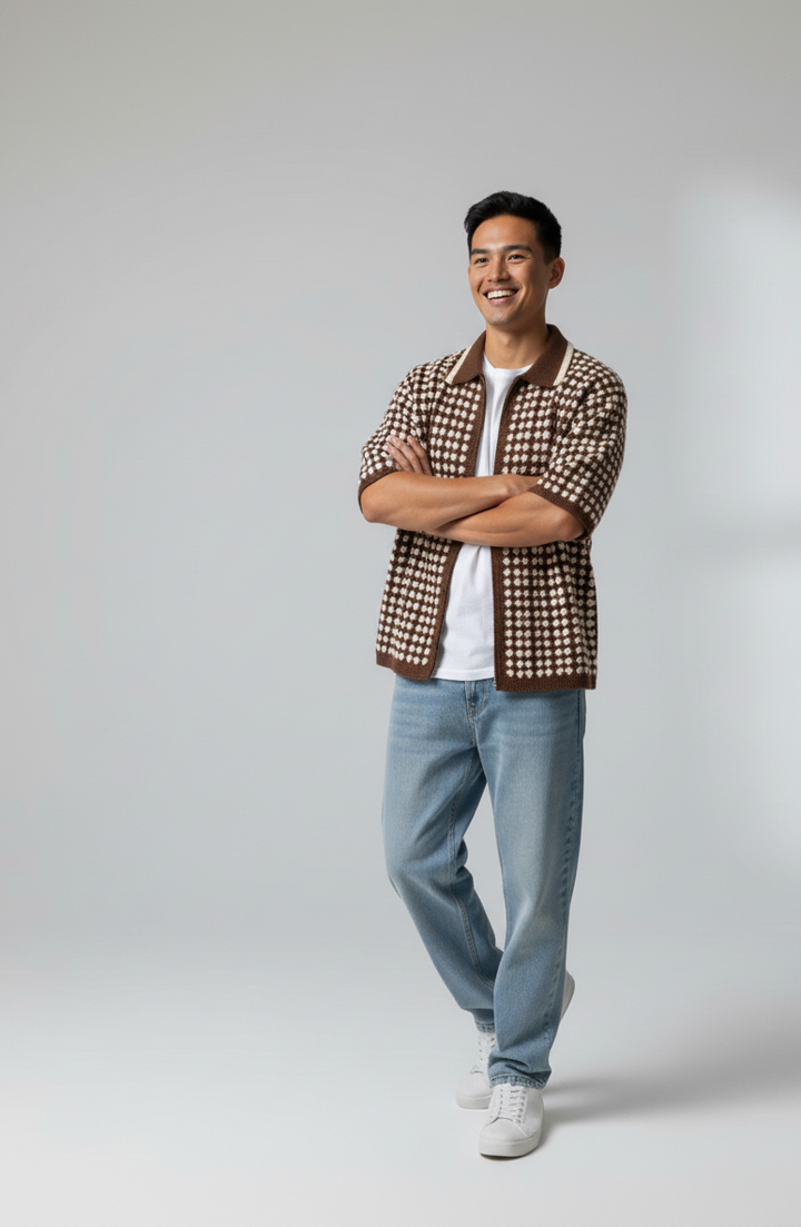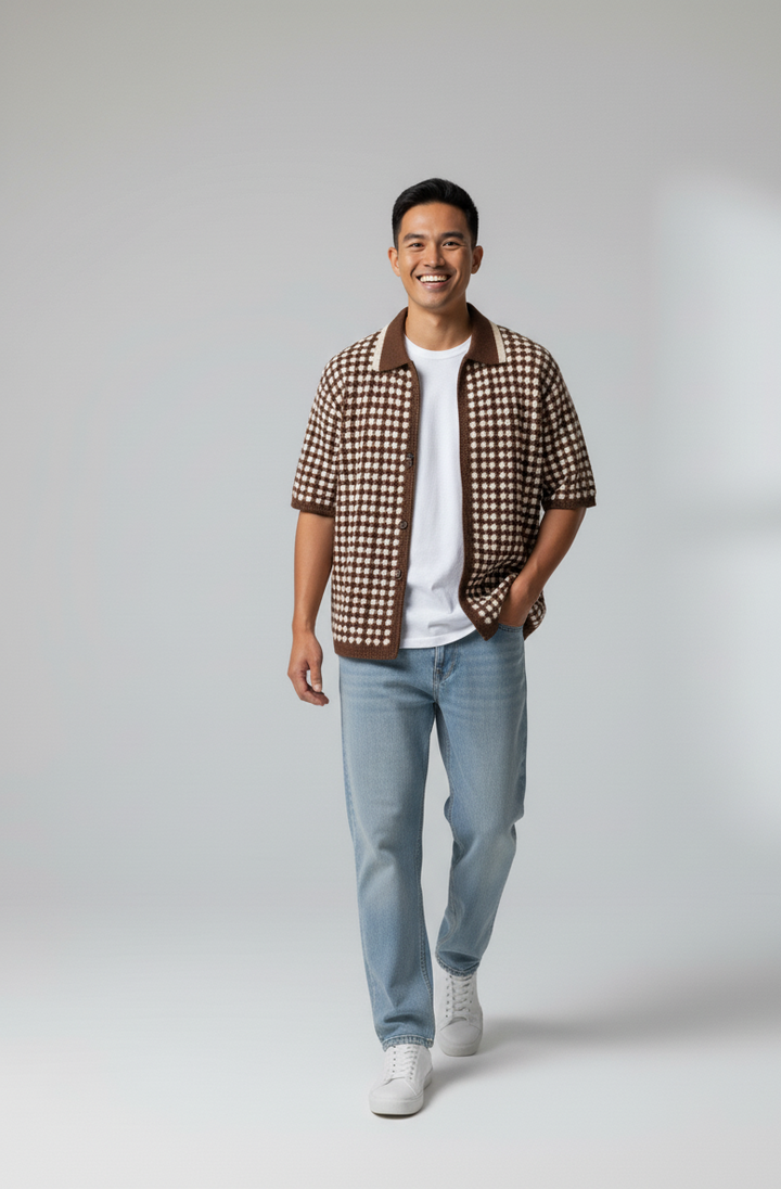 Handmade Brown & Beige Crochet Shirt – Men’s Retro Granny Knit Short Sleeve Top