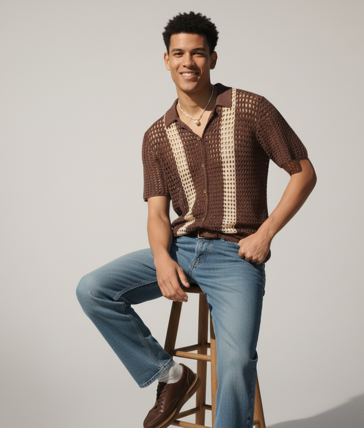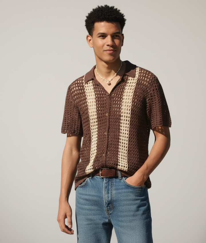 The rich brown tones pair effortlessly with denim or neutral trousers, making it perfect for casual outings, summer days, and relaxed evenings. With its airy weave, short sleeves, and open collar, this piece combines comfort, craftsmanship, and effortless style.