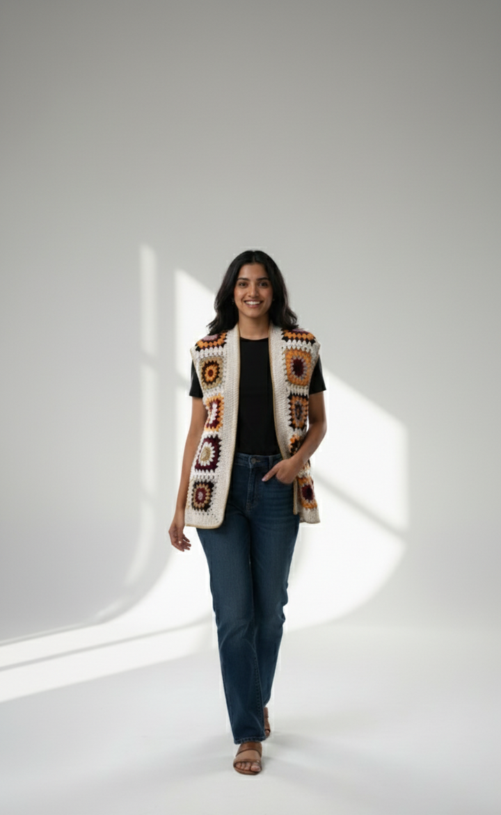 Bring vintage charm and artisan warmth to your wardrobe with our Handmade Crochet Granny Square Vest — a timeless layering piece that captures the spirit of boho fashion and slow living.
