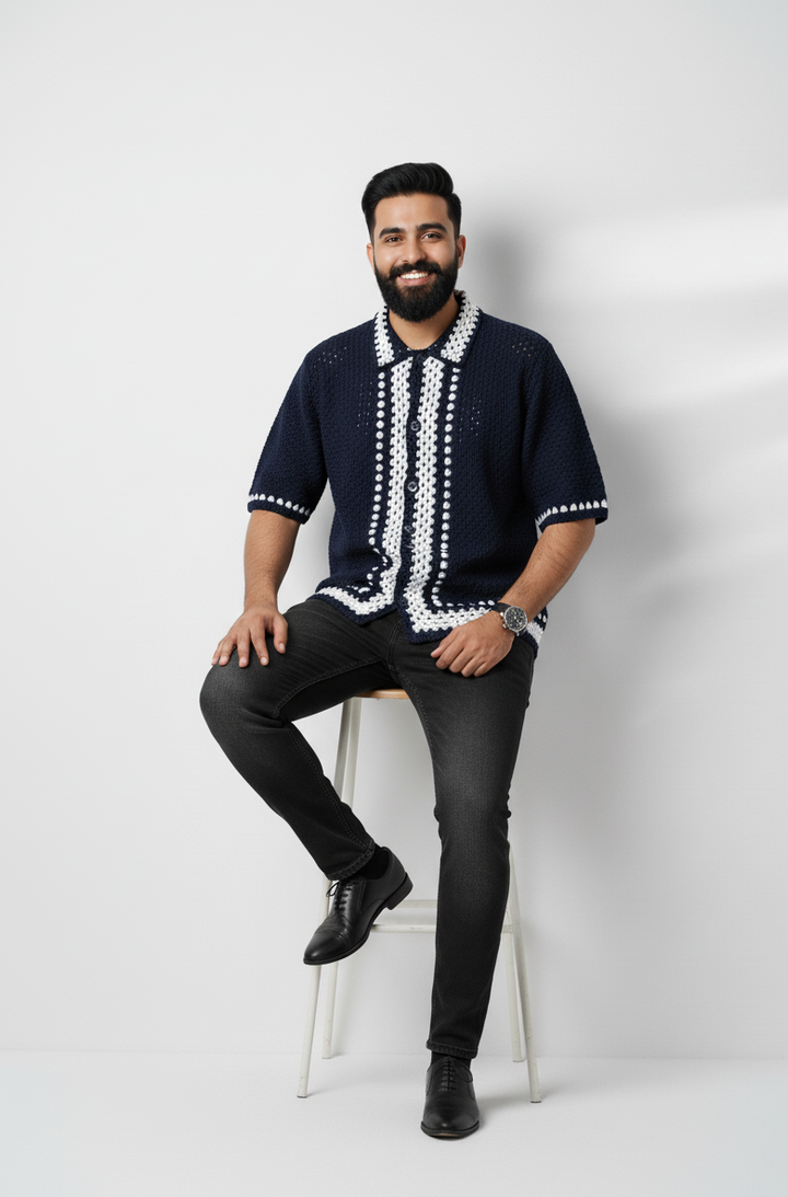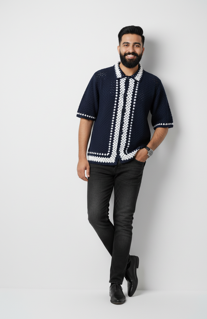 A sophisticated take on relaxed menswear, this navy crochet button-up shirt brings texture and confidence to any casual look. Expertly crafted with a breathable knit and accented with bold white contrast detailing, it combines modern design with timeless charm. The soft, airy fabric keeps you comfortable all day, while the tailored fit ensures a clean, structured silhouette. Pair it with black jeans or chinos for effortless style that works from brunch to evening gatherings. Perfect for men who value craftsmanship, comfort, and understated elegance.