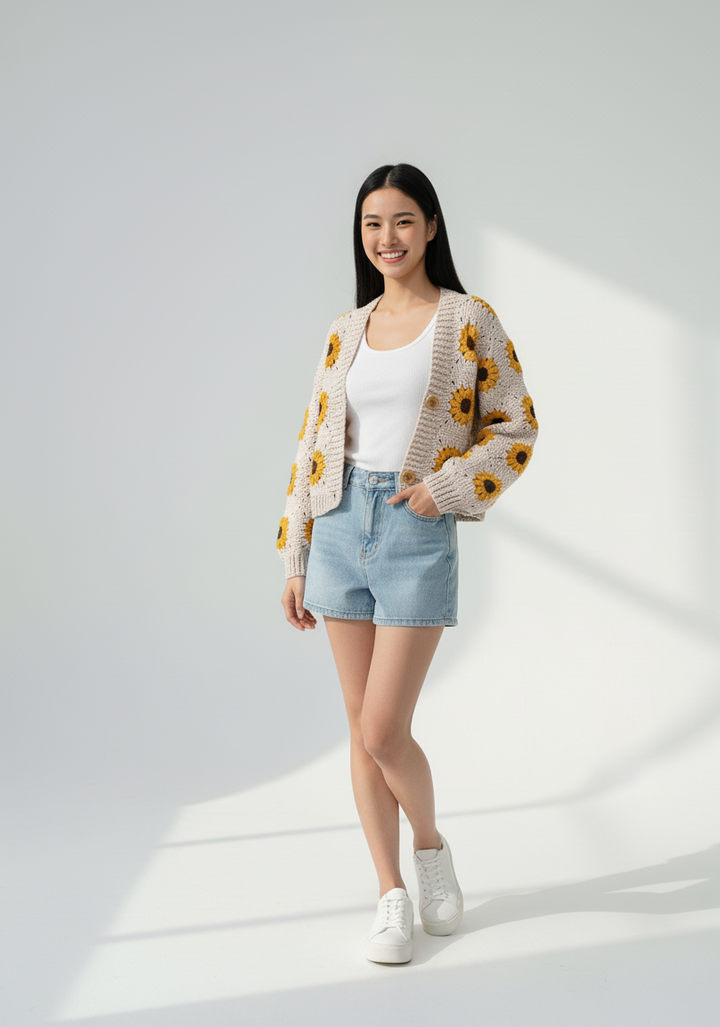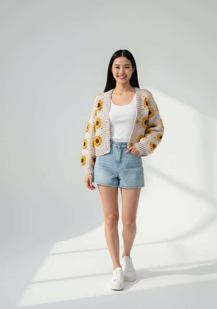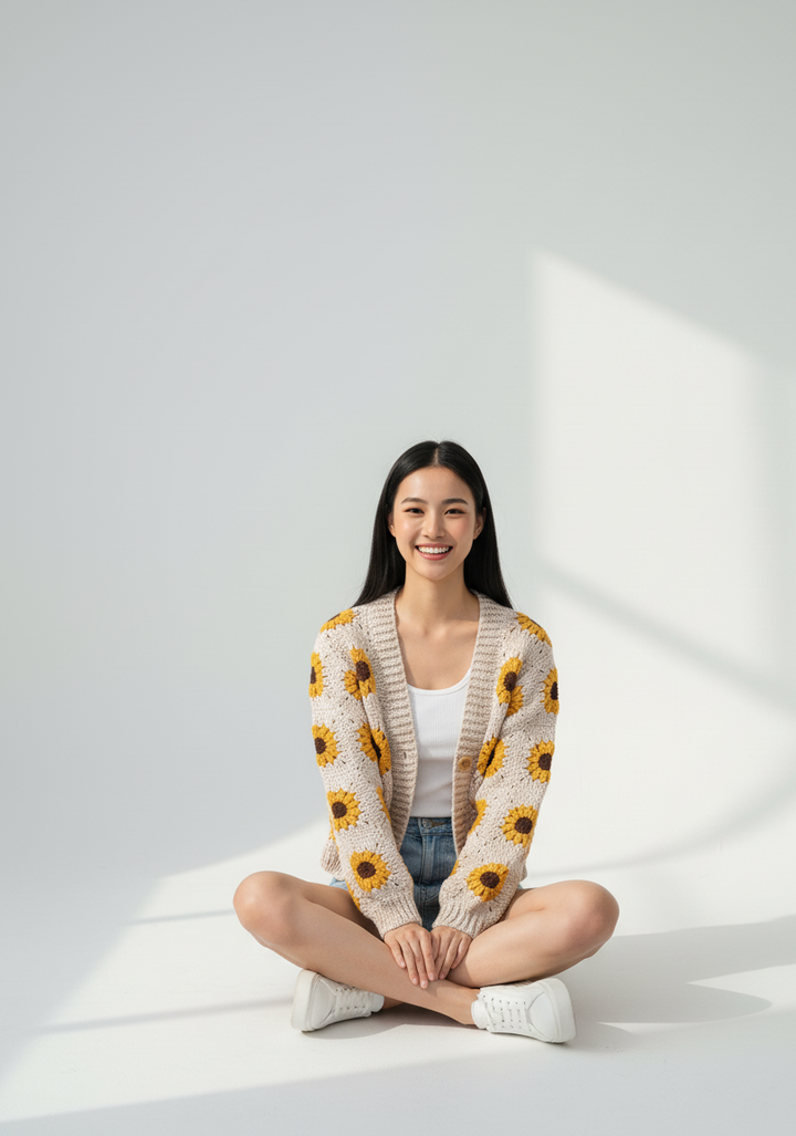 Each piece is lovingly hand-crocheted with soft, breathable yarn featuring vibrant sunflower motifs on a creamy beige base. The intricate floral design and wooden button details make it a perfect statement piece for every season β whether layered over jeans, dresses, or your favorite lounge outfit.