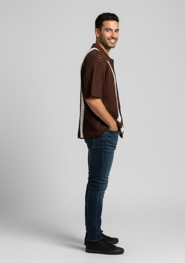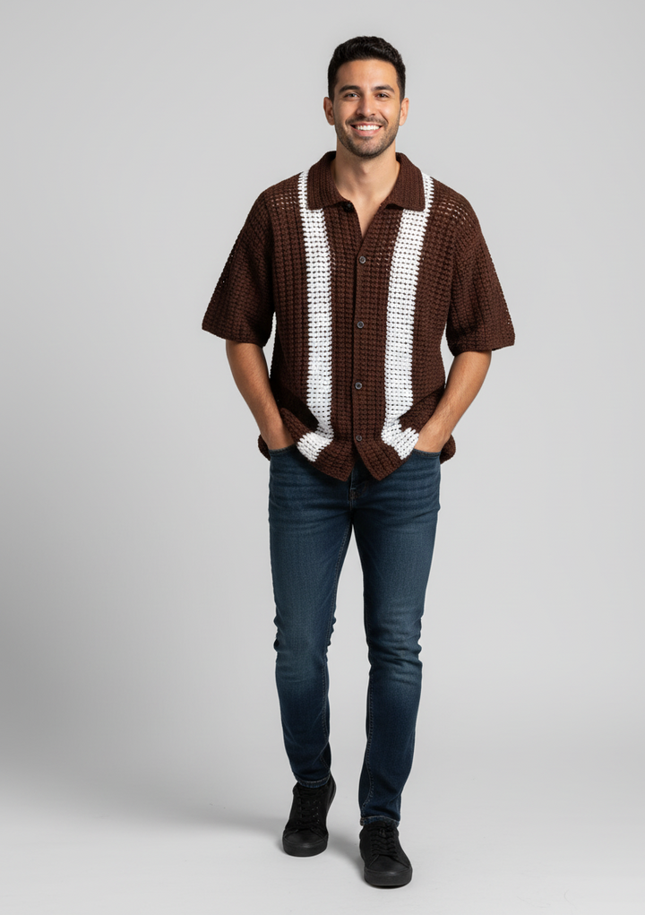 Men’s Brown Crochet Button-Up Shirt – Handcrafted Short Sleeve Knit Top with White Stripes