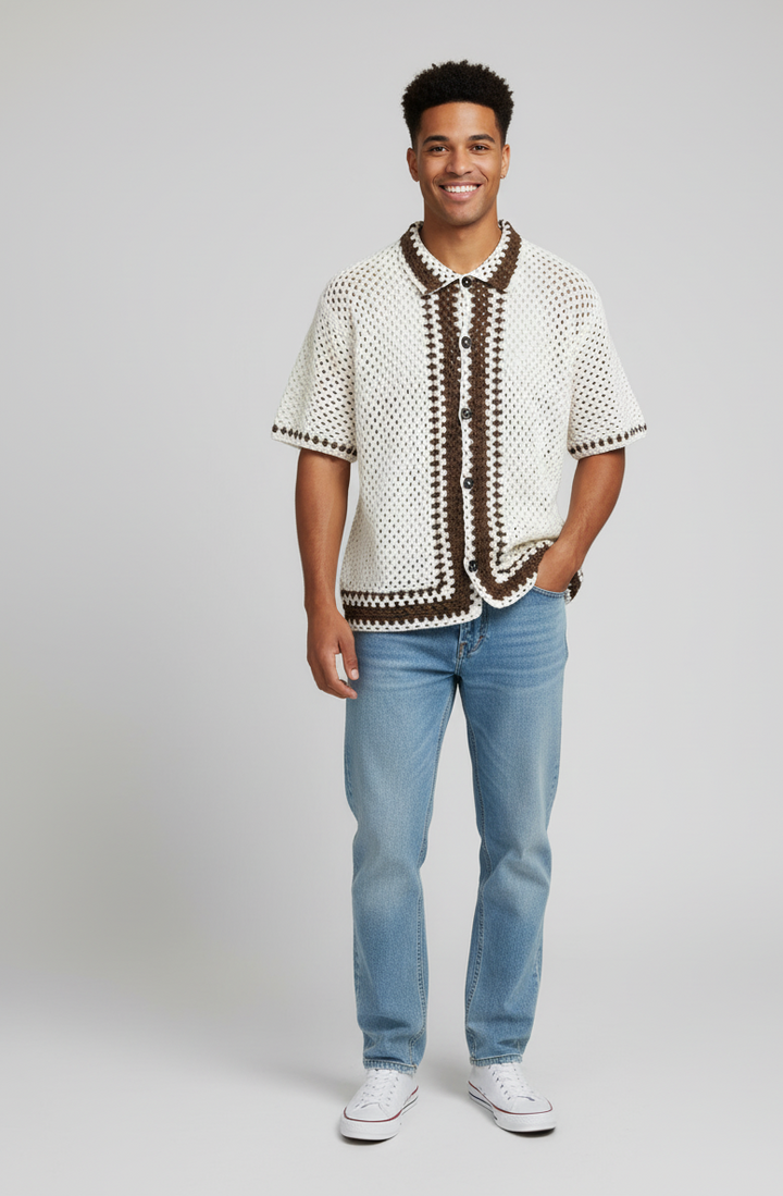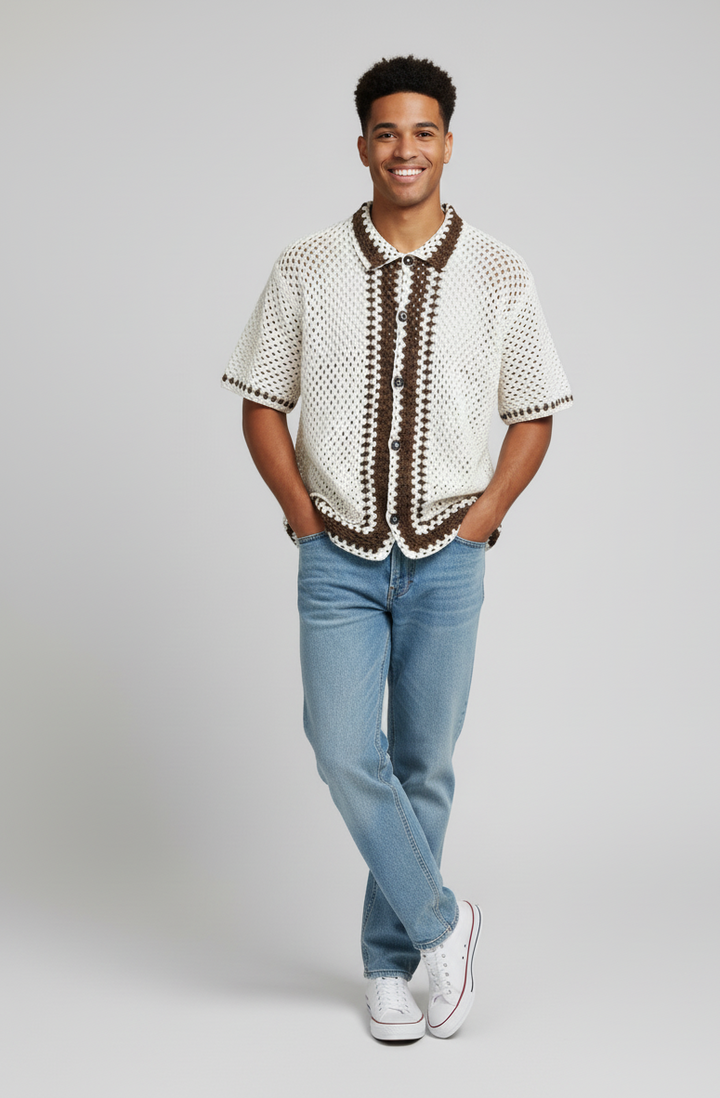 Step up your casual style with this Men’s Crochet Button-Up Shirt, crafted from a soft knit blend for comfort and breathability. The cream base with brown detailing delivers a vintage-inspired, boho look that’s both modern and timeless. Featuring short sleeves, a relaxed fit, and a button-down front, this shirt pairs perfectly with jeans or chinos for a laid-back yet polished outfit.
