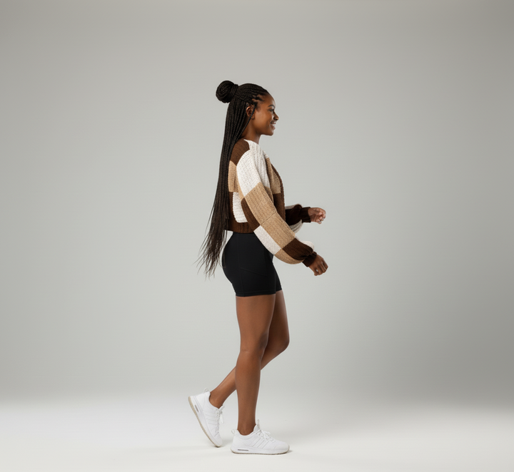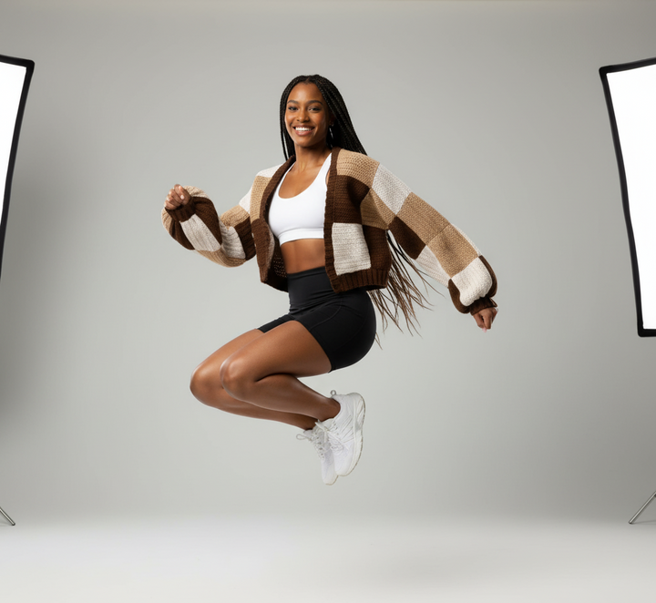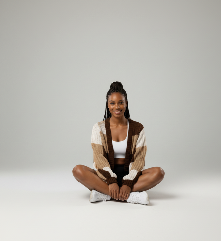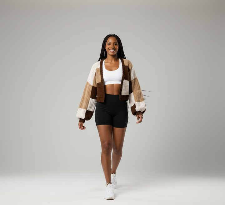 Designed with soft, cozy yarn and a relaxed oversized fit, this cardigan features an eye-catching brown, beige, and cream block pattern that adds a touch of modern chic to your everyday wardrobe.
